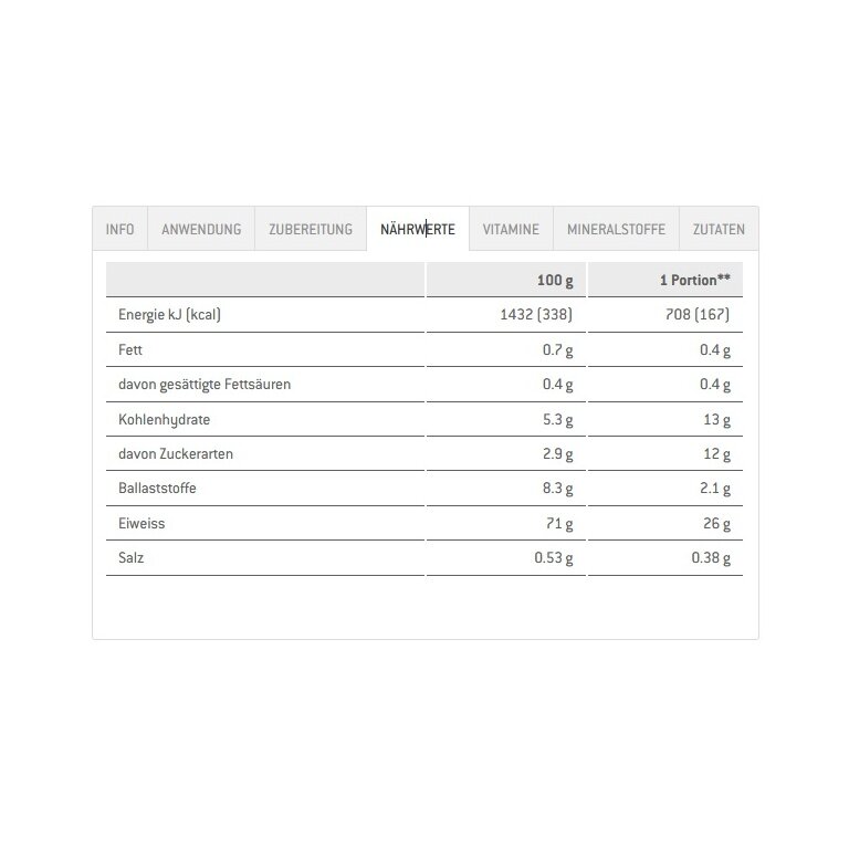 - suitable as a protein- and fibre-rich meal for a calorie-reduced diet, particularly with a reduced carbohydrate content (low carb)