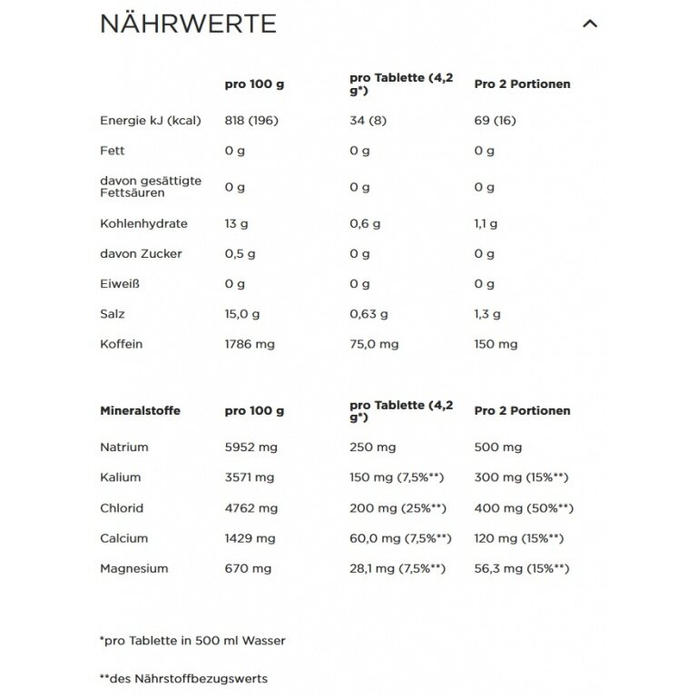 - 5ELECTROLYTES effervescent tablets create a high-quality, calorie-free sports drink with the 5 main electrolytes in the ratio you lose through sweat - ideal for endurance training and whenever you are doing sports but do not want to consume calories or carbohydrates