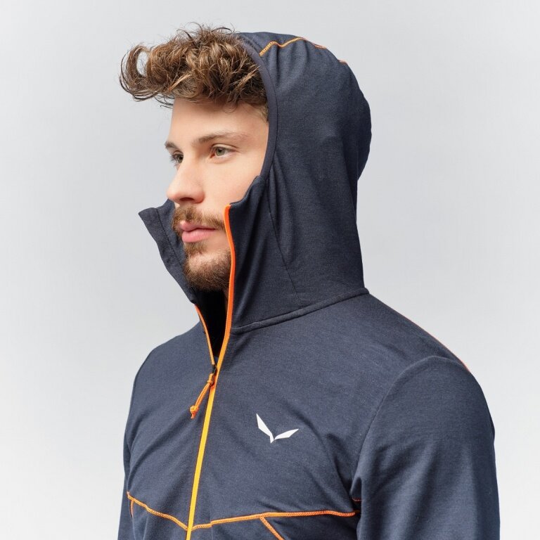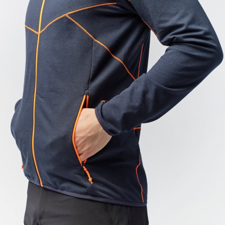 - a versatile, compactly stowable and quick-drying men's fleece jacket with hood for alpine trekking and speed hiking