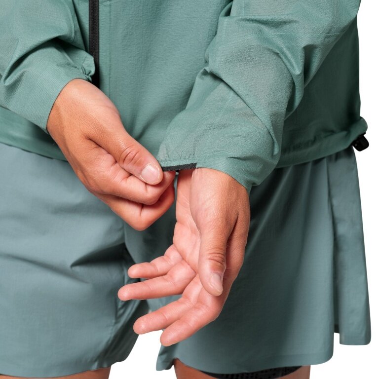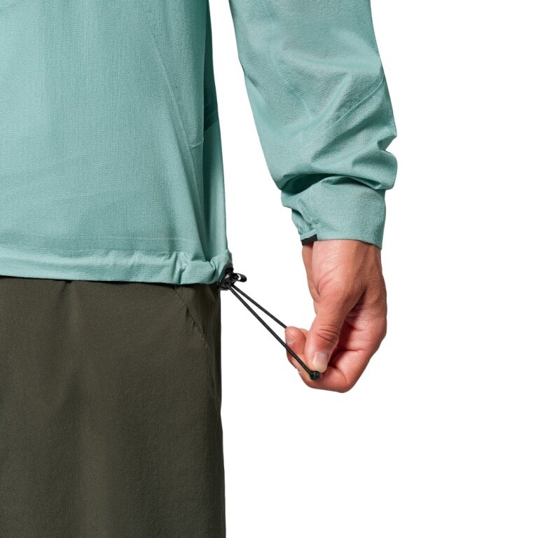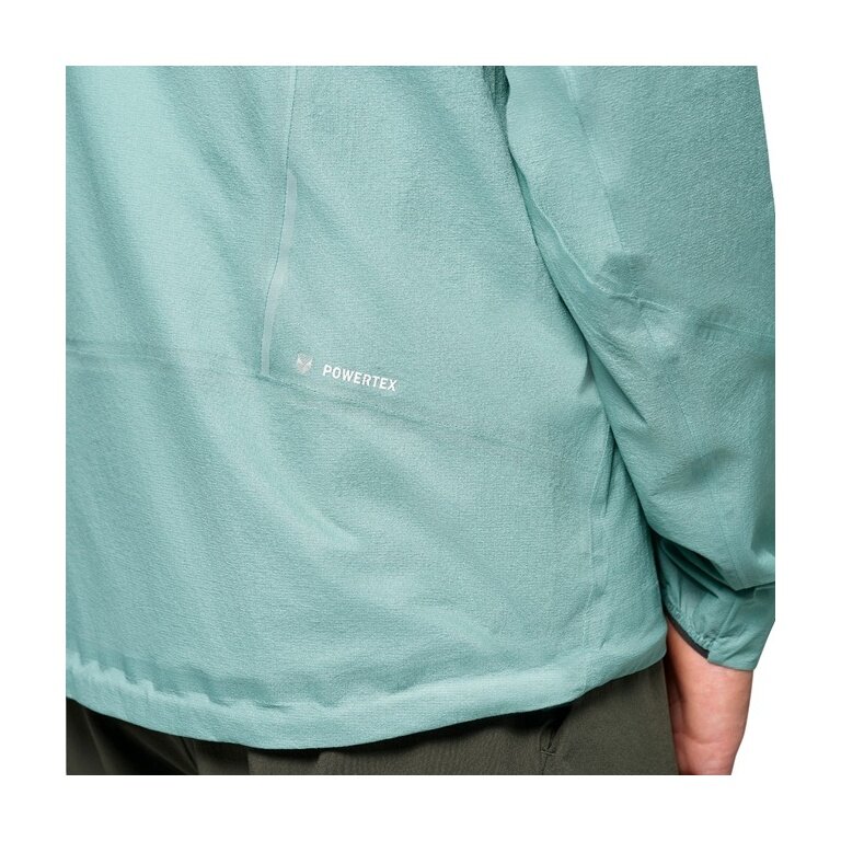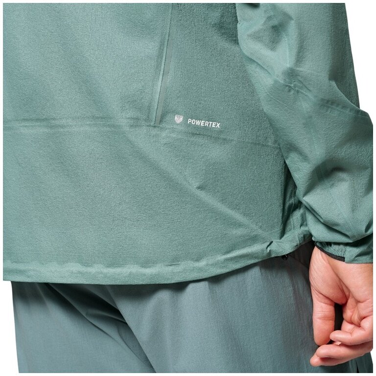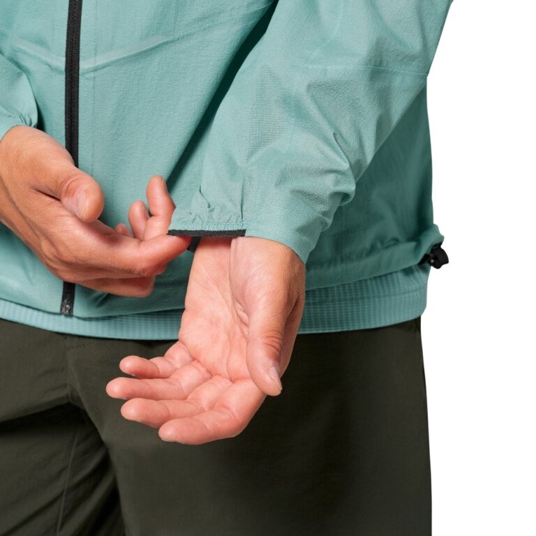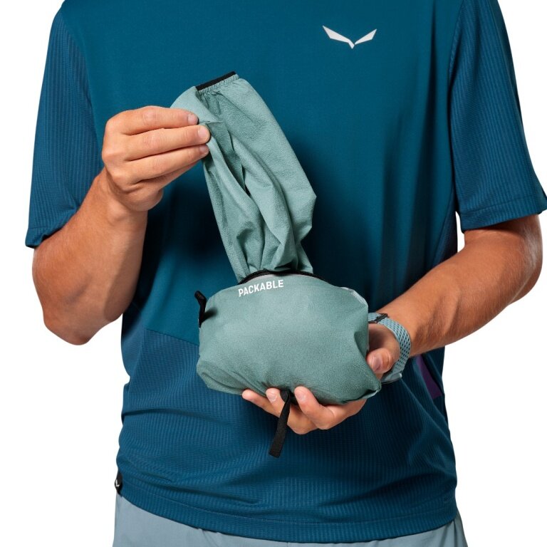 - waterproof and windproof, as well as breathable 2.5-layer jacket for men for speed hiking, featuring fully taped seams, a storm hood, and a chest pocket in which the jacket can be stowed away