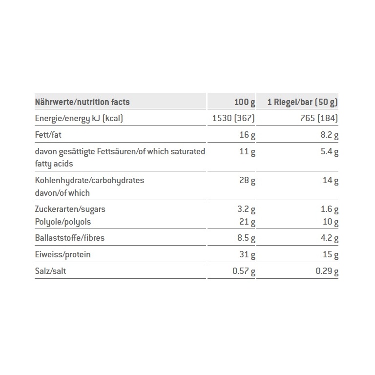 - Ingredients: Milk chocolate coating with sweetener 31% (sweetener maltitol, cocoa butter, whole milk powder, cocoa mass, emulsifier soy lecithin, flavour), caramel layer 18% (polydextrose [dietary fibre], condensed milk, cocoa butter, moisture-retaining agent sorbitol, emulsifier mono- and diglycerides of fatty acids, flavour, table salt, colour caramel), milk protein, collagen hydrolysate, soy crispies 9% (soy protein, rice flour, barley malt extract, table salt), moisture-retaining agent glycerin, soy protein, coconut fat, flavour, low-fat cocoa powder, sunflower oil. May contain traces of egg, nuts, and peanuts