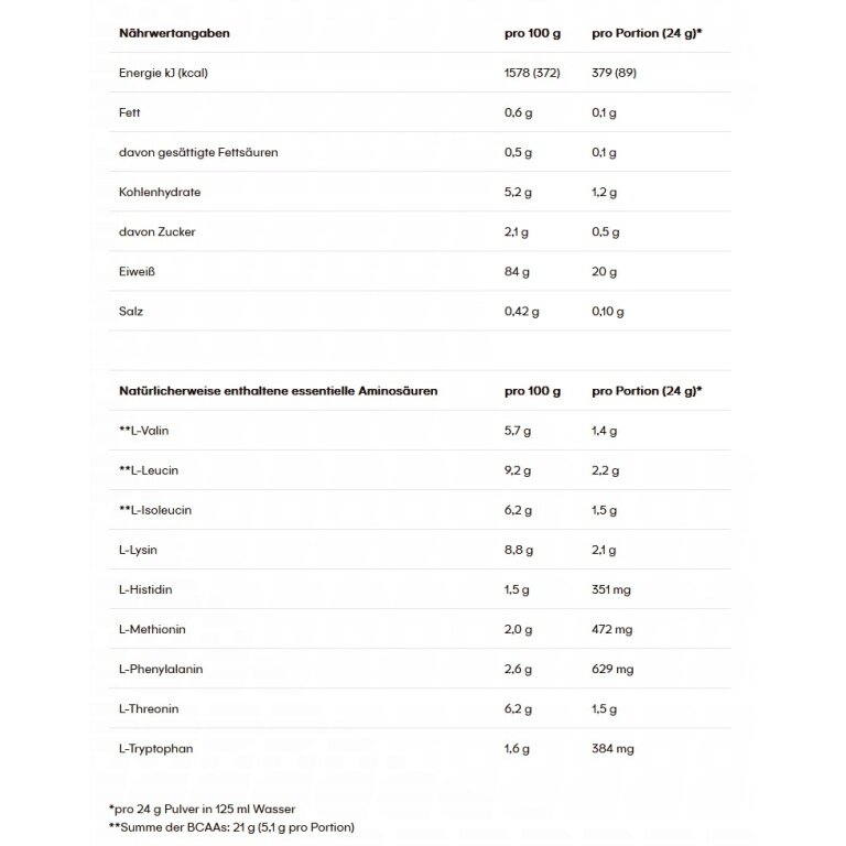 - Whey protein isolate is a quickly absorbed protein source by the body and provides important amino acids, is sugar- and fat-free and of the highest quality