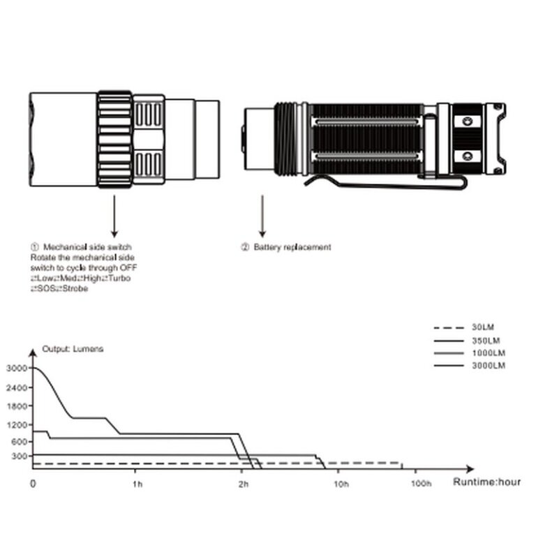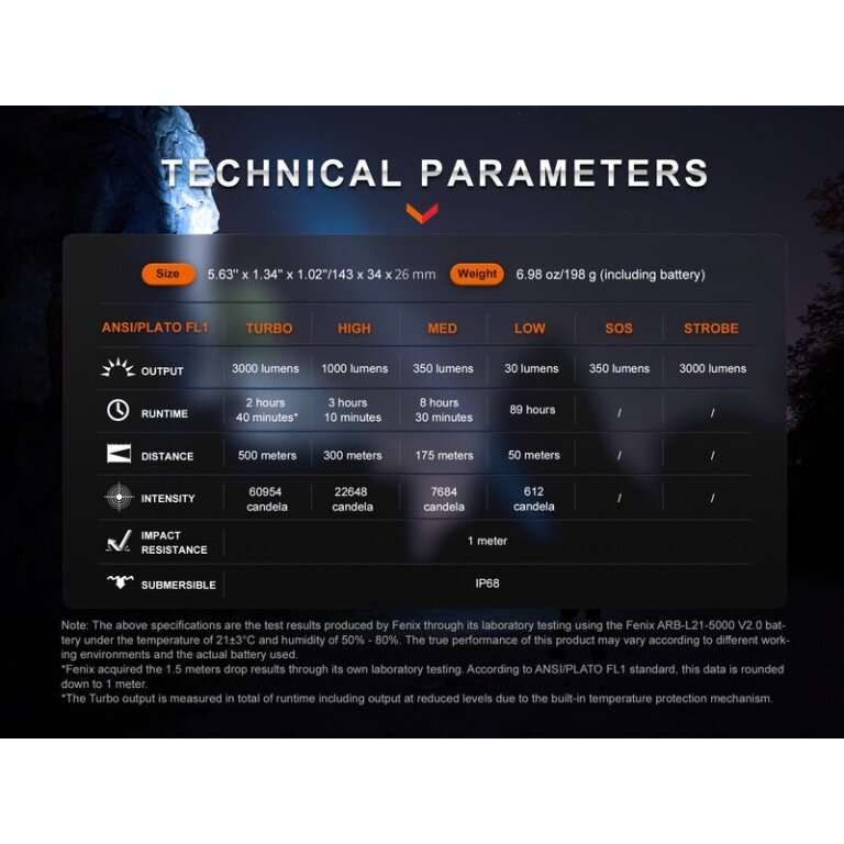 - Note: The values mentioned above were determined in the laboratory using a Fenix ARB-L21-5000 V2.0 LiIon battery and may vary between flashlight, battery, and environment. The brightness level "Turbo" is measured cumulatively including overheating protection.