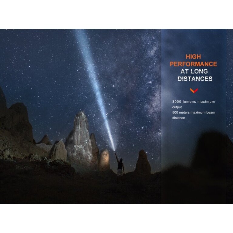 - 3,000 Lumens maximum output, 500 meters maximum range