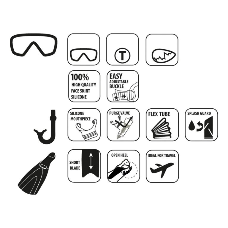 - The fins: open at the back with an adjustable strap so the fin can grow with children's feet, anatomically shaped, short fin blade (travel-friendly and easier to handle).