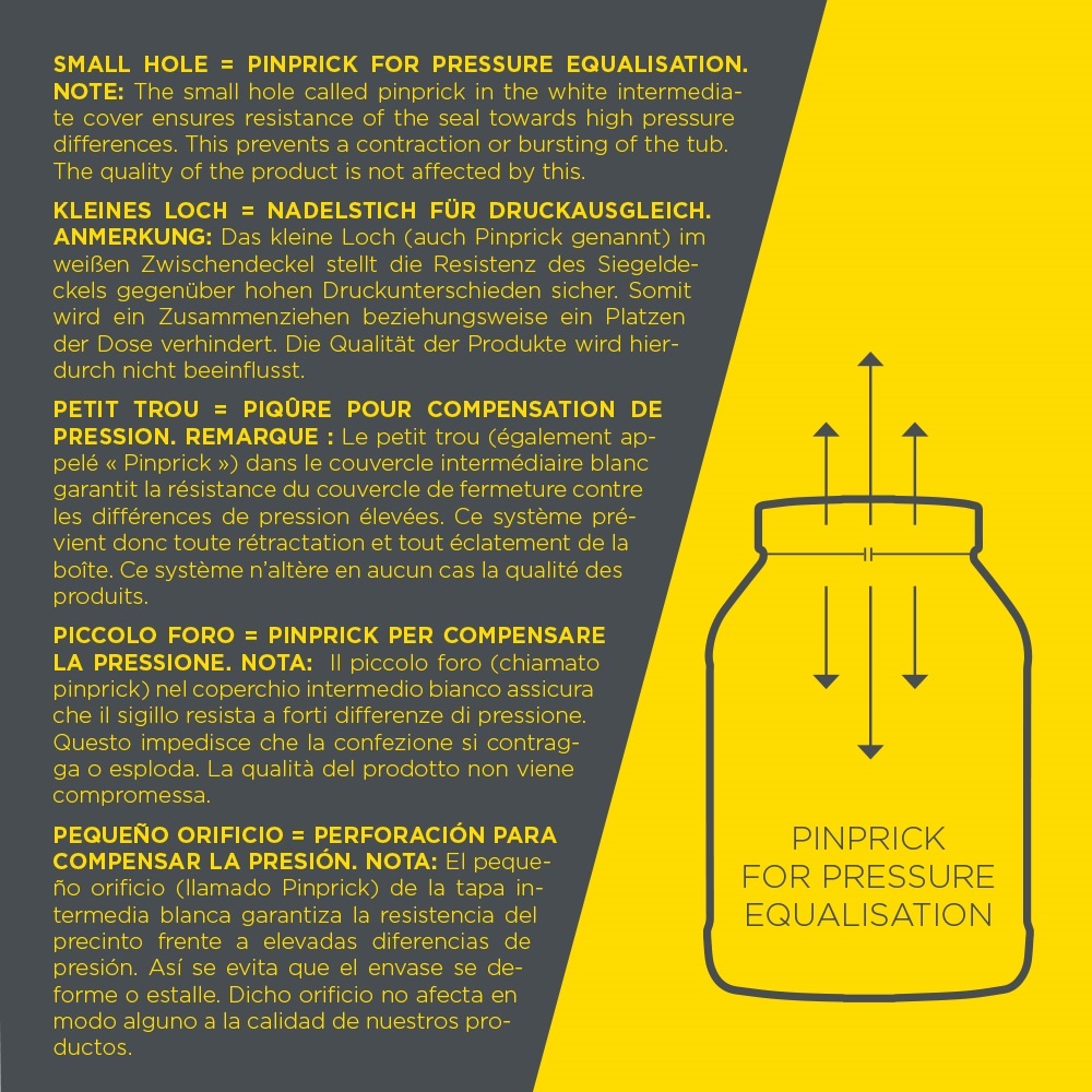 • This hole is necessary to prevent deformation of the can due to pressure equalization during transport and does not affect the quality of our products in any way