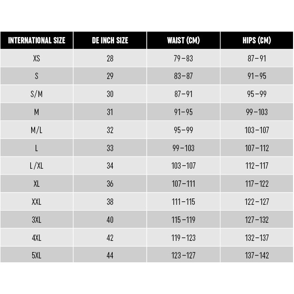 • Size: 28=XS, 29=S, 30=S/M, 31=M, 32=M/L, 33=L, 34=L/XL, 36=XL, 38=XXL (Regular Fit)