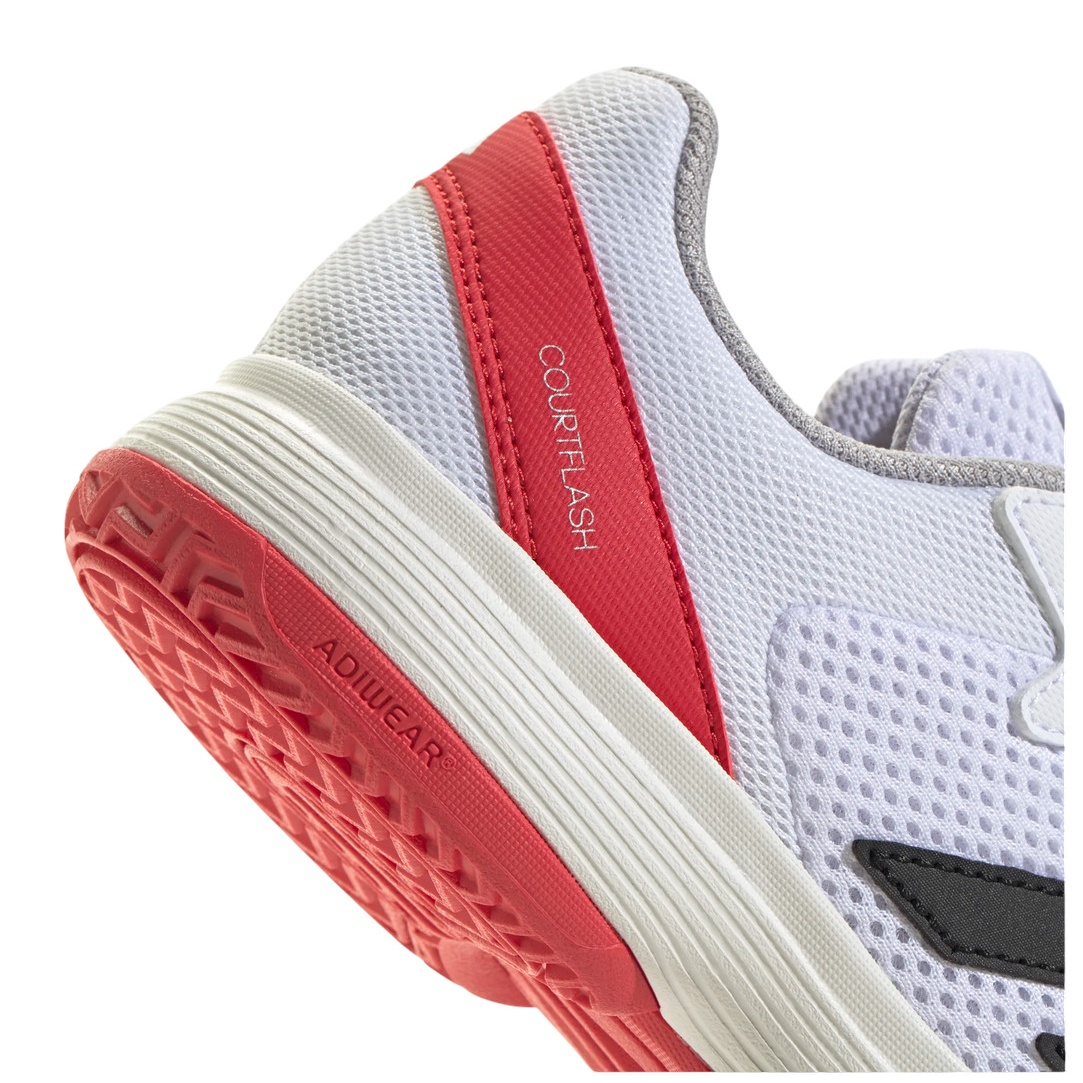 • This adidas Courtflash shoe for children features a mesh upper for cool comfort and a durable Adiwear outsole that withstands rapid direction changes and nimble footwork.