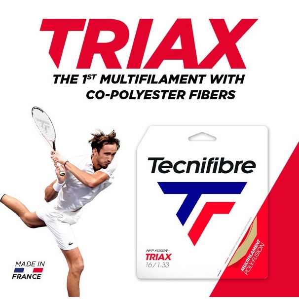 • Triax, the first multifile co-polyester multifilament, is the first of its kind. Tecnifibre offers, for the first time, an answer to the following challenge.