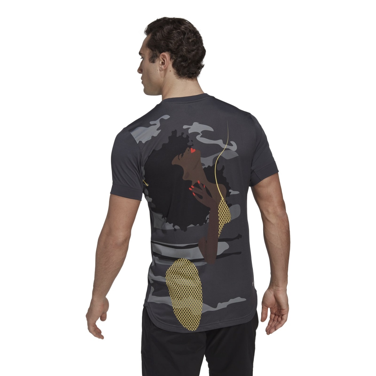 • on the back of this adidas T-shirt, the striking graphic of a dancing woman radiates positive vibes