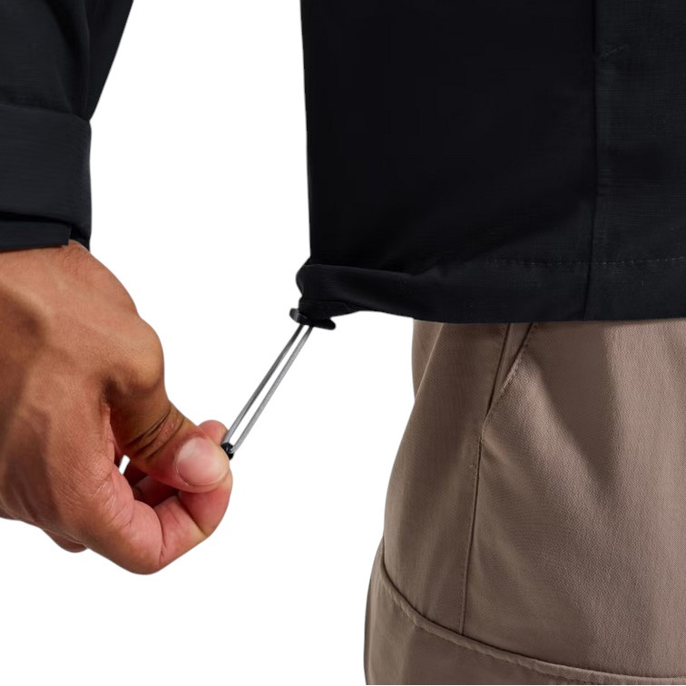 • two-point hood adjustment for a snug fit to protect against rain from all directions