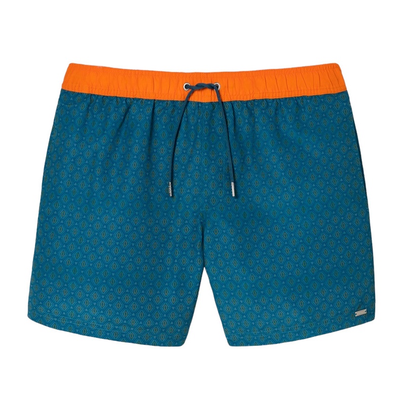 • petrol-coloured swim shorts for men with diamond pattern and orange waistband