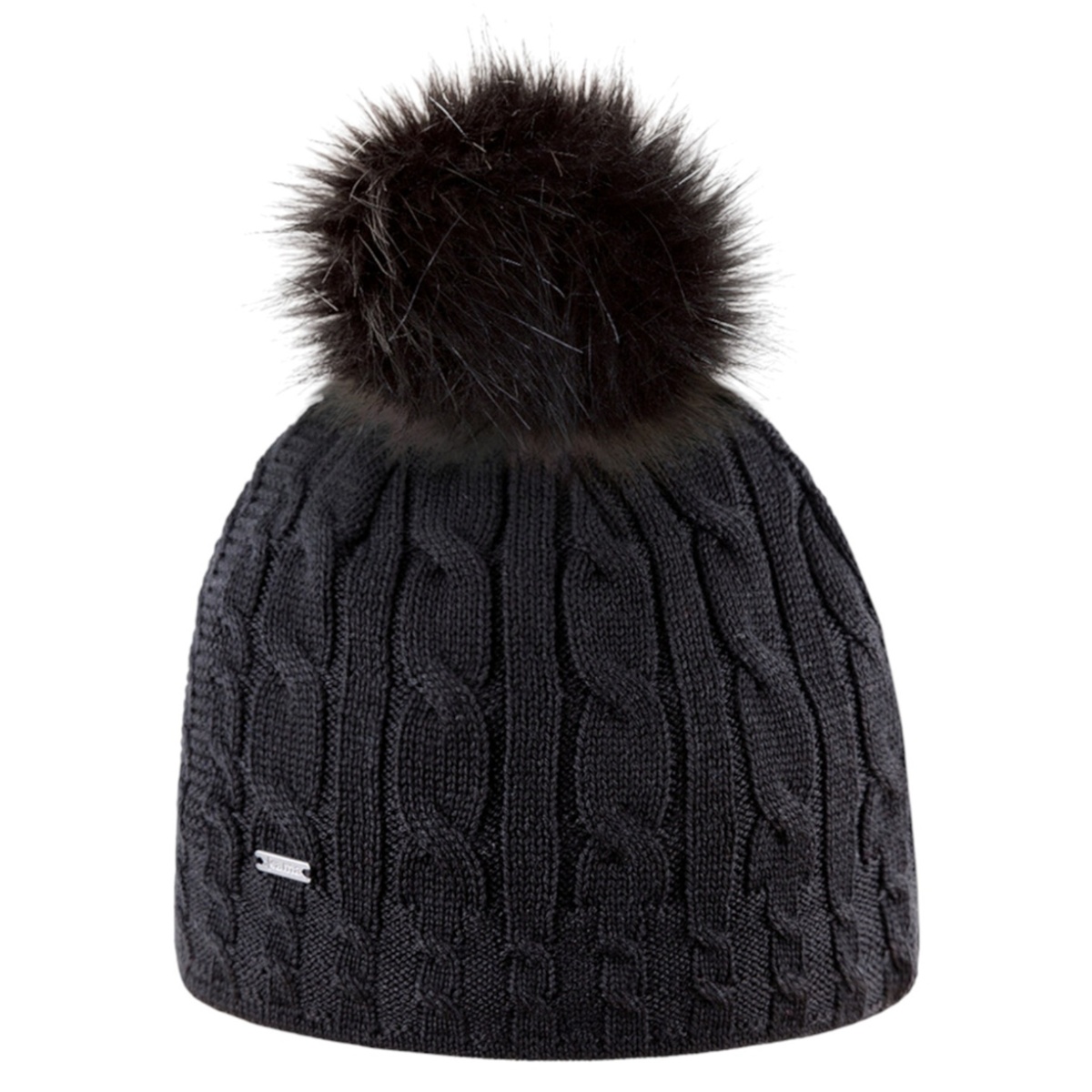 • women's hat for the city and slopes with lining made from a fine fleece fabric, crafted from a solid-colour cable knit pattern, complemented by a large pom-pom made of faux fur.