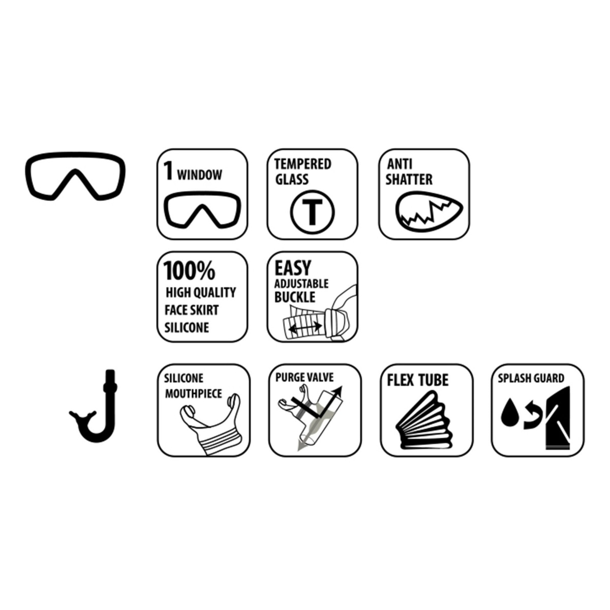 • Delivery includes: 1x diving goggles made from safety glass, 1x snorkel with Easy Clip holder, splash guard, and purge valve