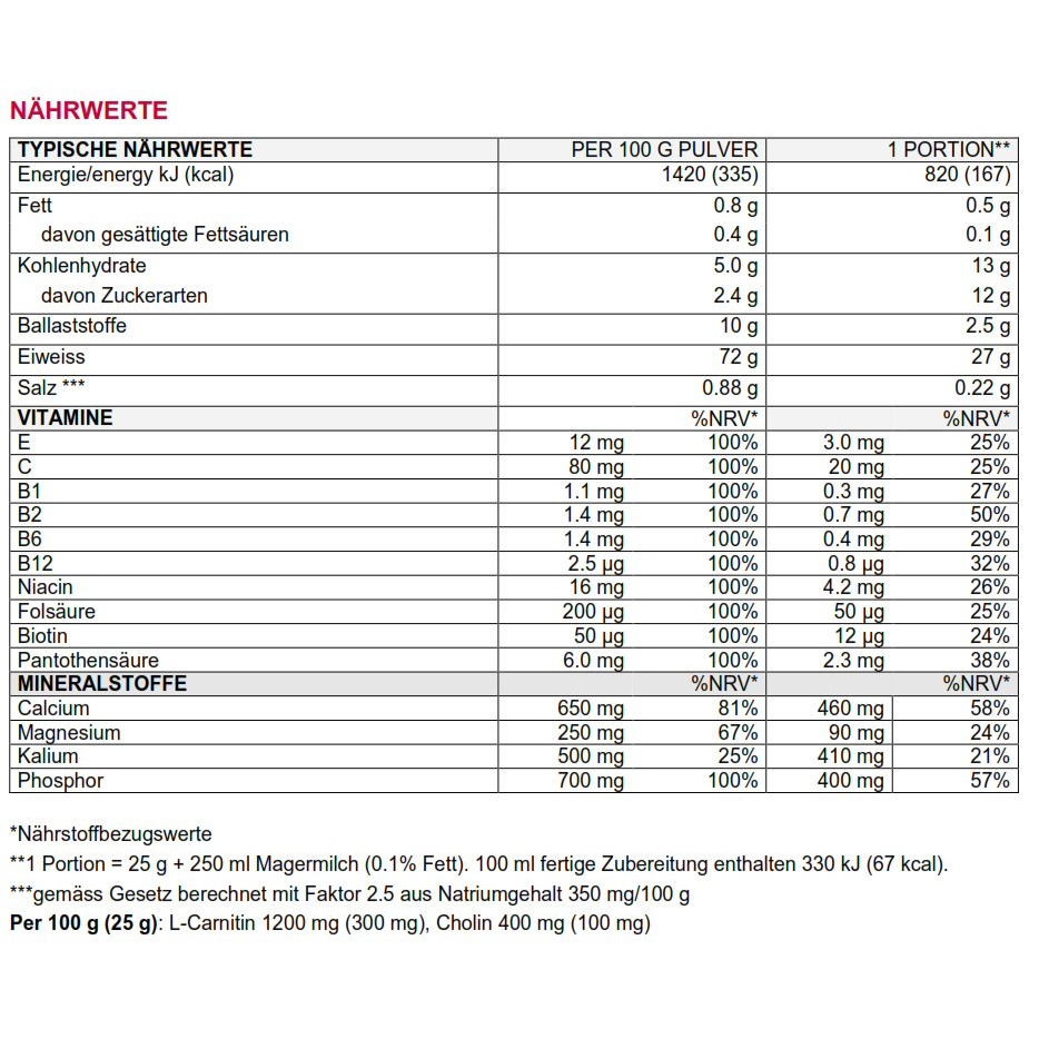 • 1 portion (25g powder + 300ml skimmed or low-fat milk) covers around 1/4 of the daily requirement of 10 selected vitamins