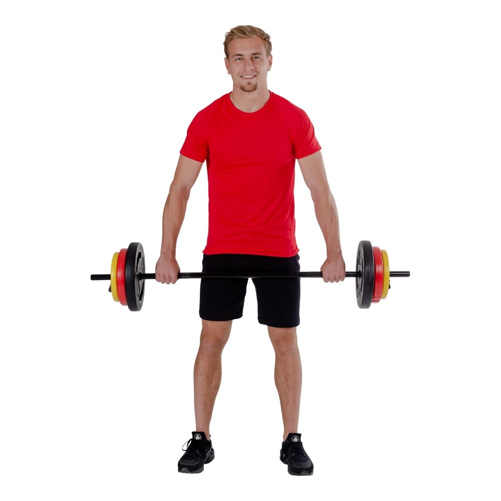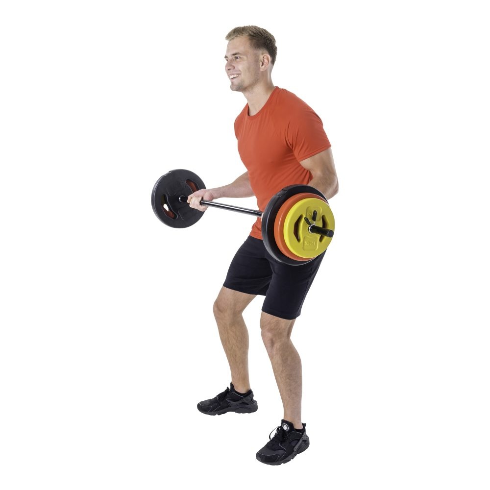 • the included pairs of weight plates are 2 x 5 kg plates in black, 2 x 2.5 kg plates in red, and 2 x 1.25 kg plates in yellow