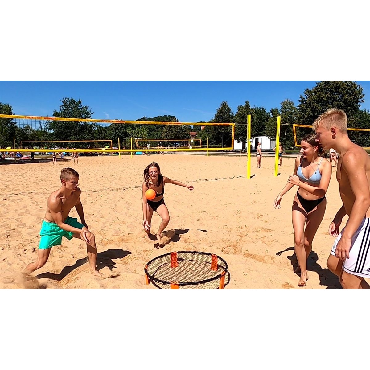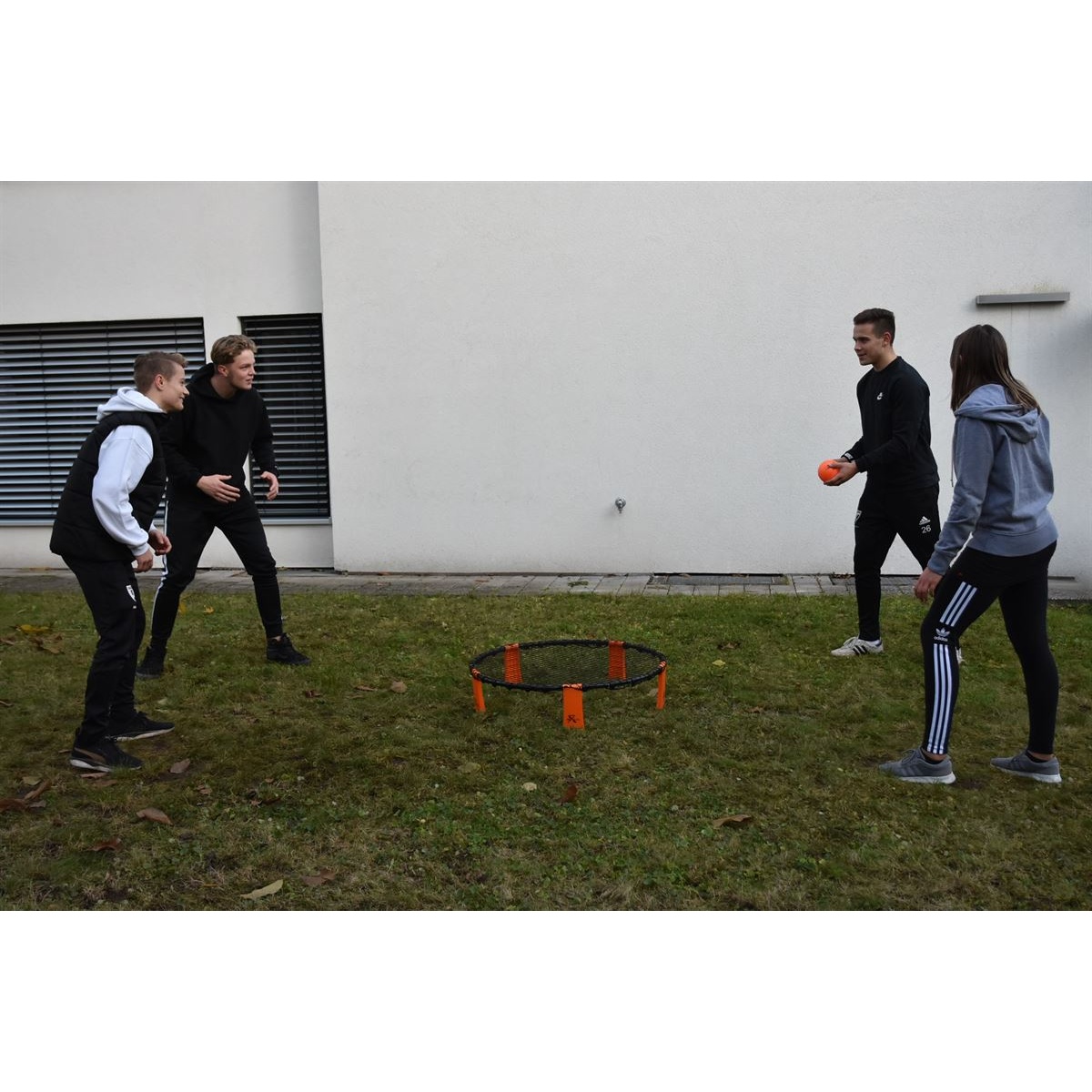 • the set for 4 players consists of an easily assembled and disassembled playing field, a controllable training ball with a diameter of 12 cm, 2 game balls with a diameter of 9 cm, a pump, and a storage bag