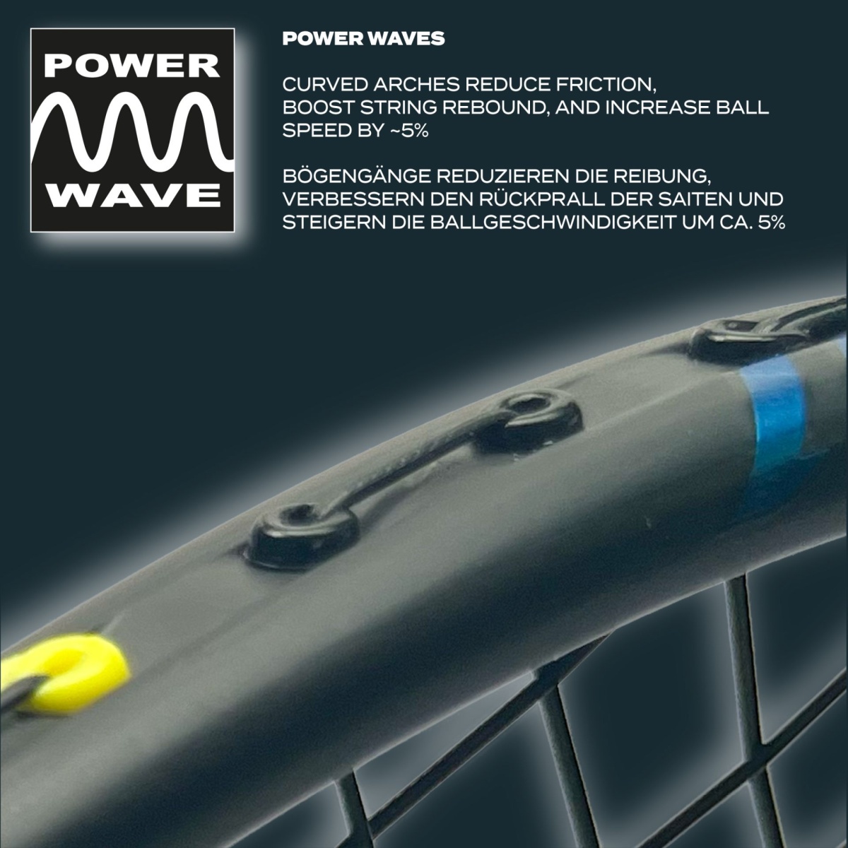 Power WavesThe arches in the frame minimize the friction resistance of the strings at the deflection points and thus ensure a lower alternating load. The resulting more elastic string bed ensures more energy transfer through increased trampoline effect and maximizes ball acceleration by approx. 5%.