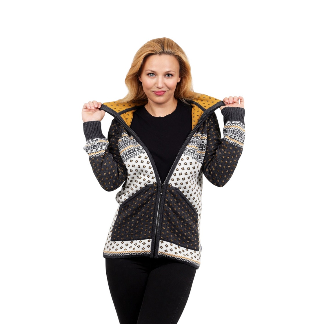 • this elegant women's hoodie with a traditional Nordic pattern is made from high-quality Merino wool from Schoeller, which is warm, breathable, and naturally resistant to odours and dirt.