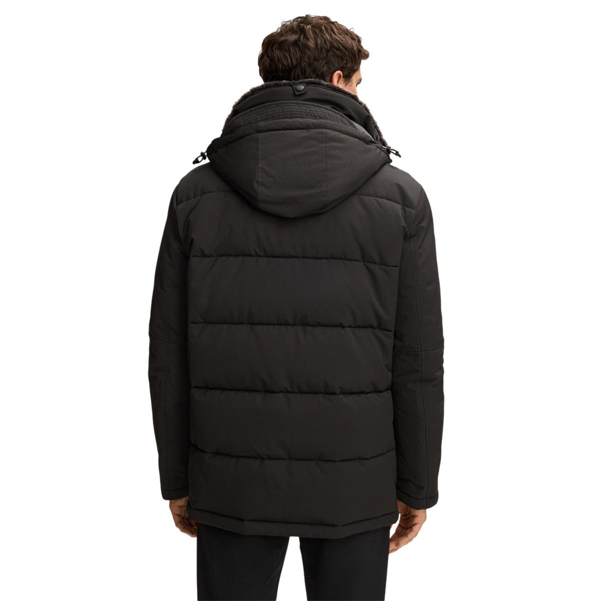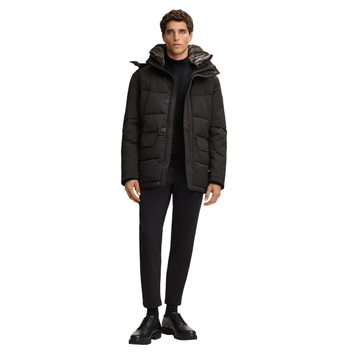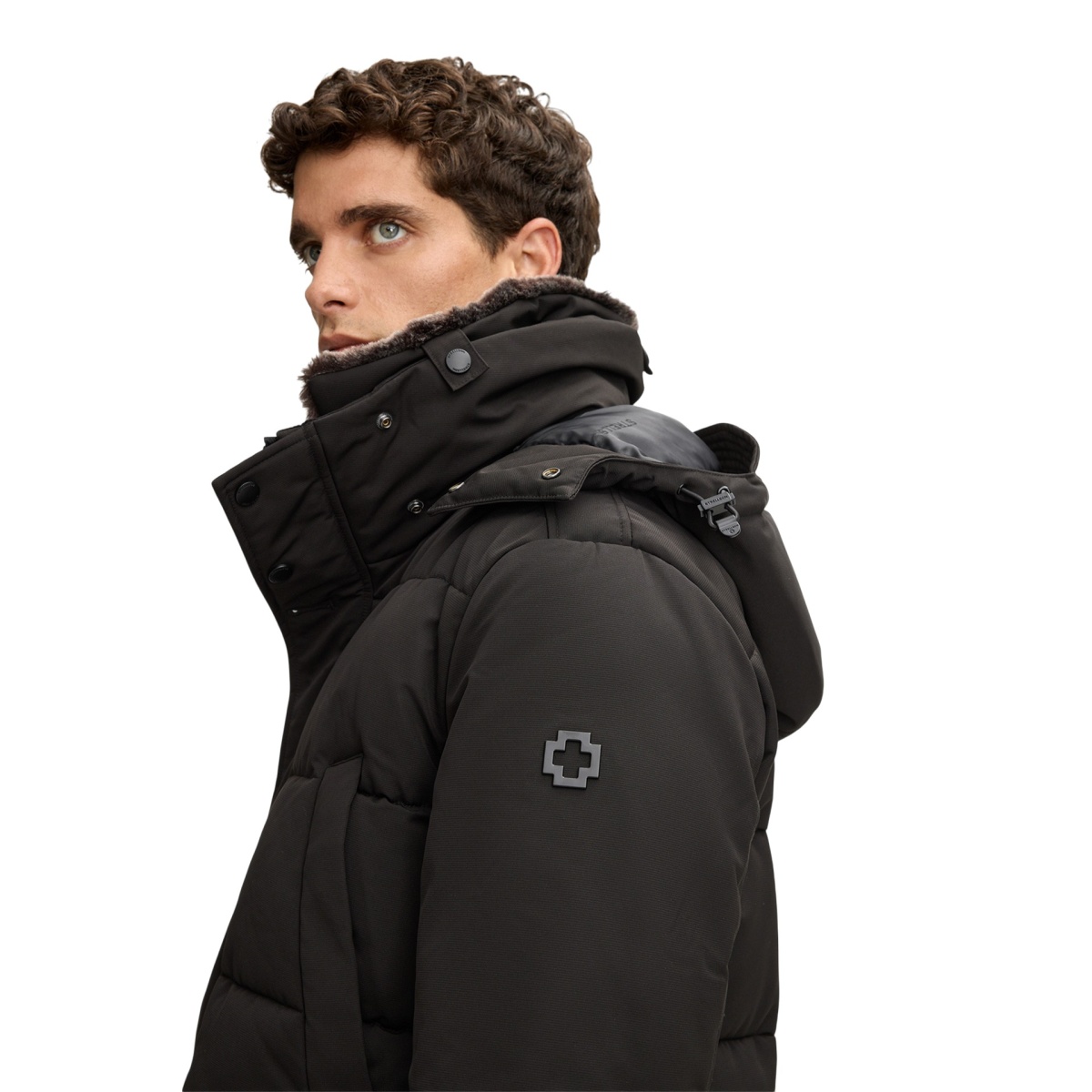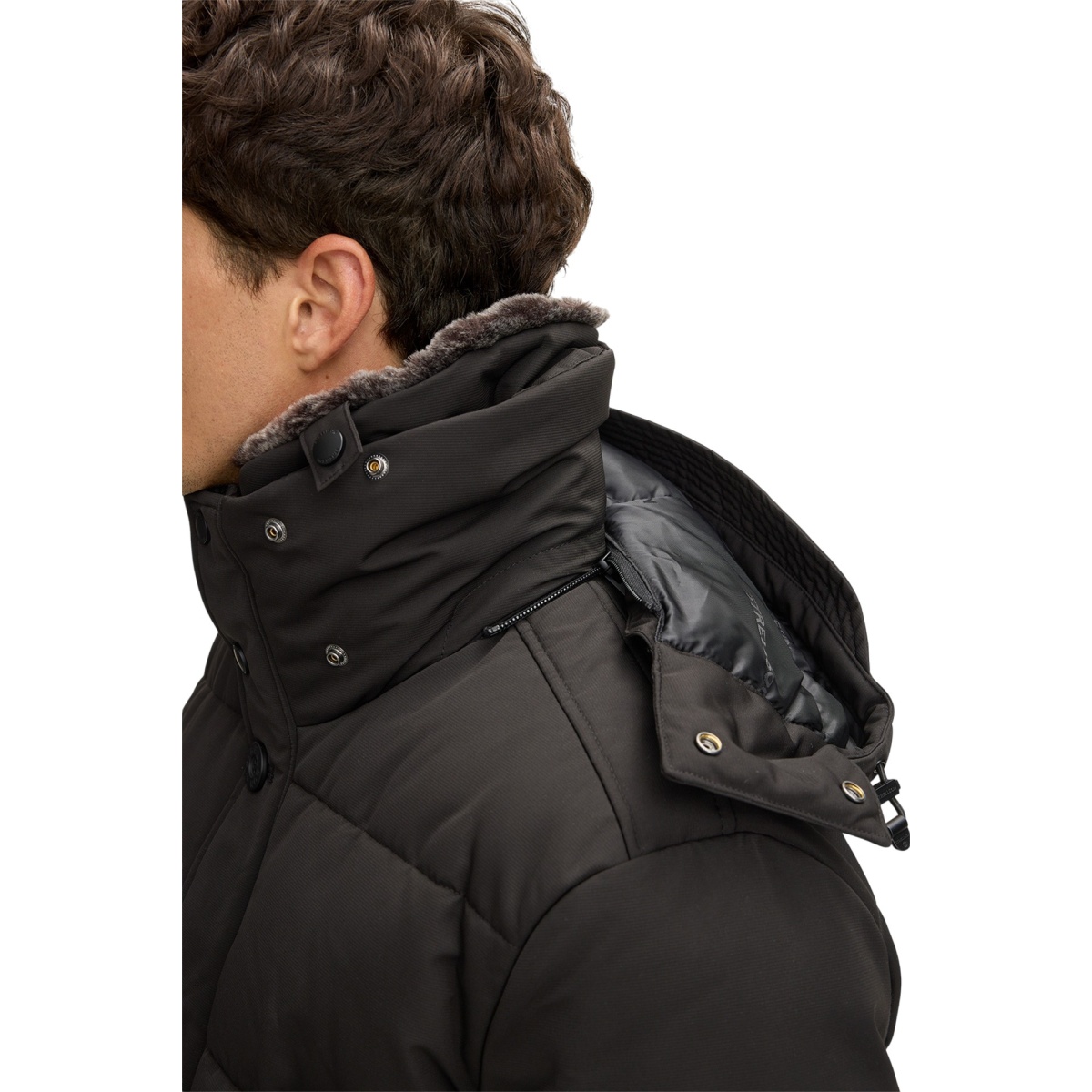 • waterproof and windproof quilted jacket with stand-up collar and detachable faux fur trim
