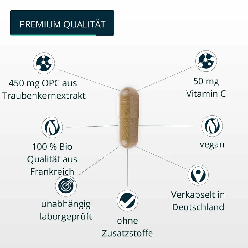 • the combination of 450 mg OPC and 50 mg Vitamin C offers you a high-quality plant-based supplement – ideal for your daily routine